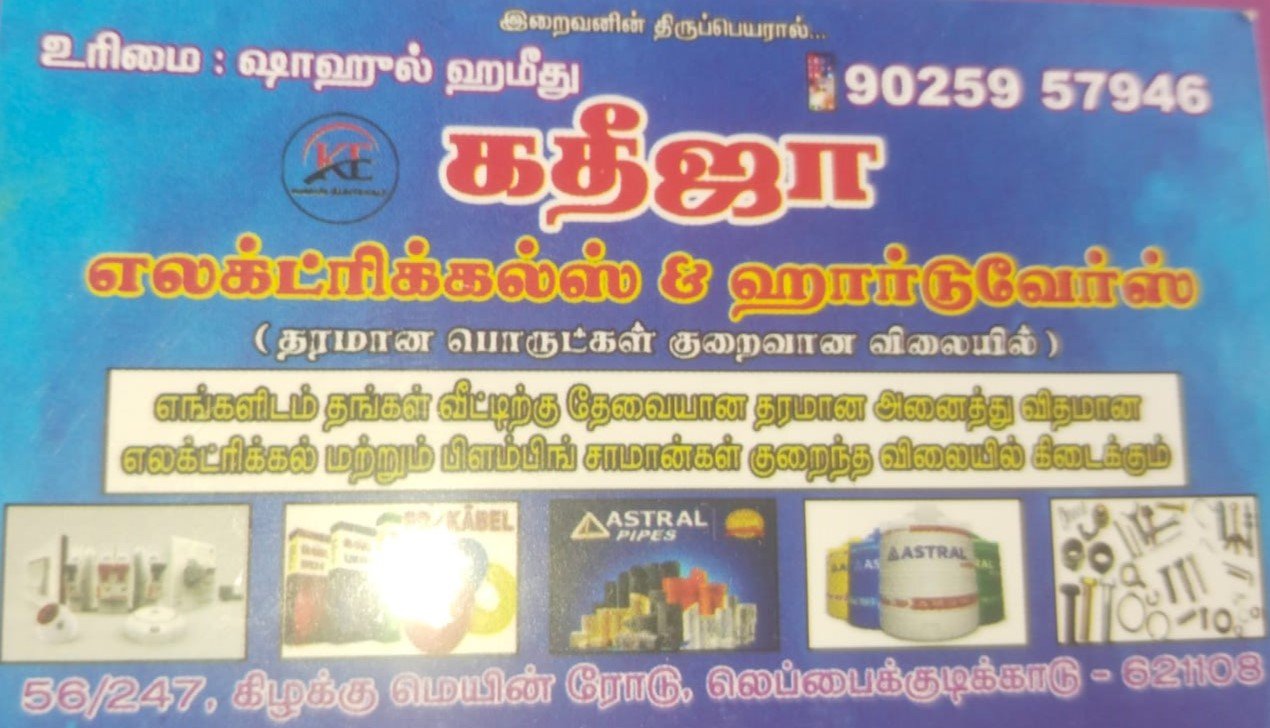 கதீஜா எலெக்ட்ரிக்கல்ஸ் & ஹார்டுவேர்ஸு க்கு உங்களை இனிதே வரவேற்கிறோம்!