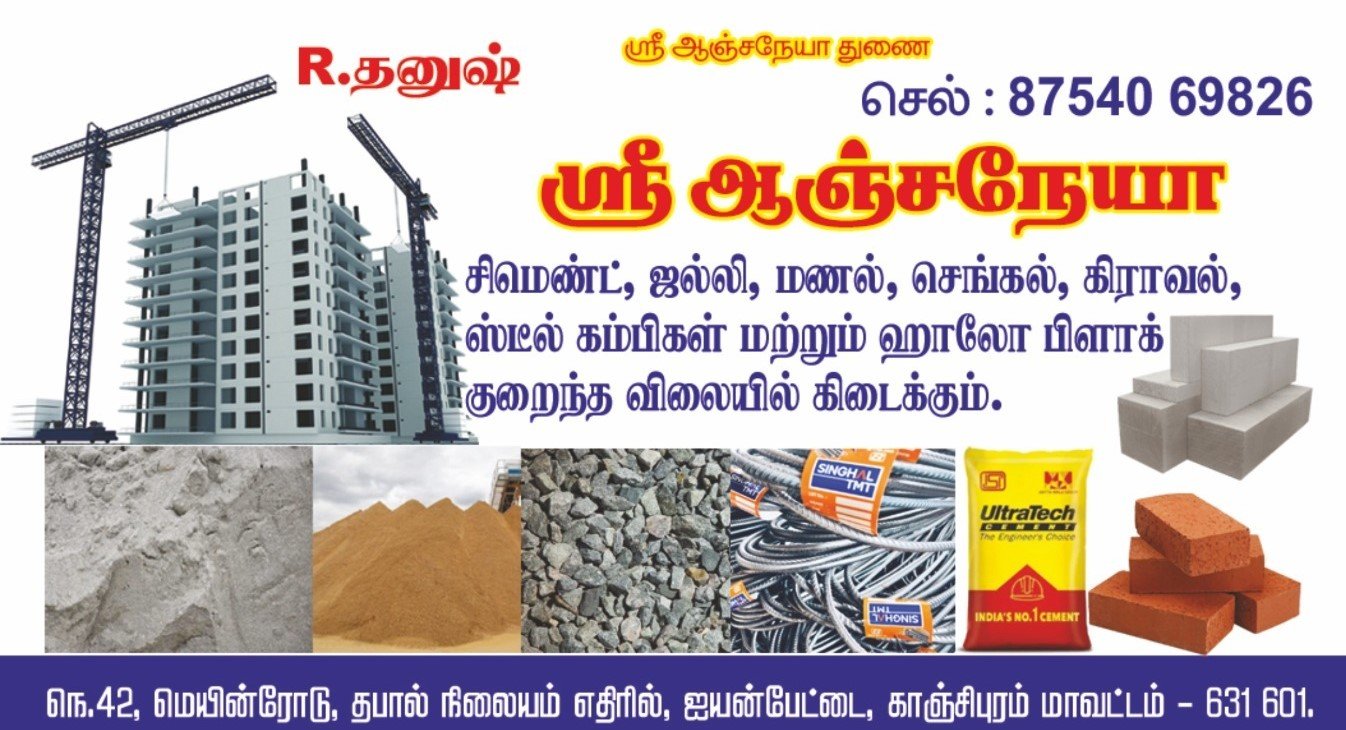 மேலும் எங்களிடம் உயர் தரமான சிமெண்ட், ஜல்லி, மணல், செங்கல், ஹாலோ பிளாக், கிராவல், ஸ்டீல் கம்பிகள் மற்றும் பல உள்ளிட்ட அனைத்து வகையான கட்டுமானப் பொருட்களும் சிறந்த முறையில் கிடைக்கும்.