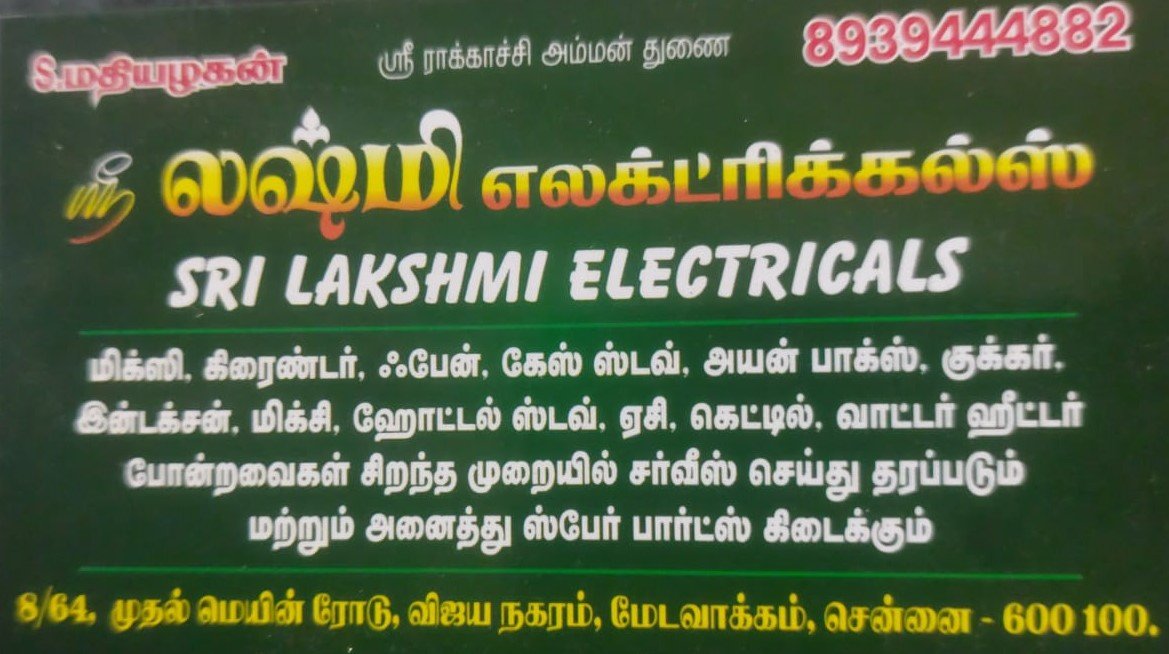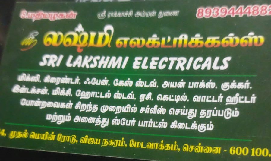 Sri Lakshmi Electricals is promoted by S.Mathiyazhagan at Chennai. We work hard to provide excellent customer service to all our clients.