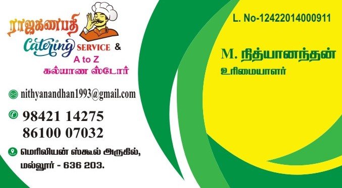 Rajaganapathi Catering Service is promoted by M.Nithyanandhan at Mallur. We work hard to provide excellent customer service to all our clients.