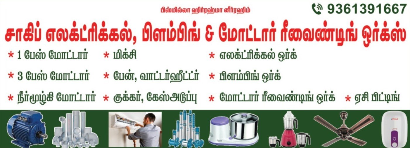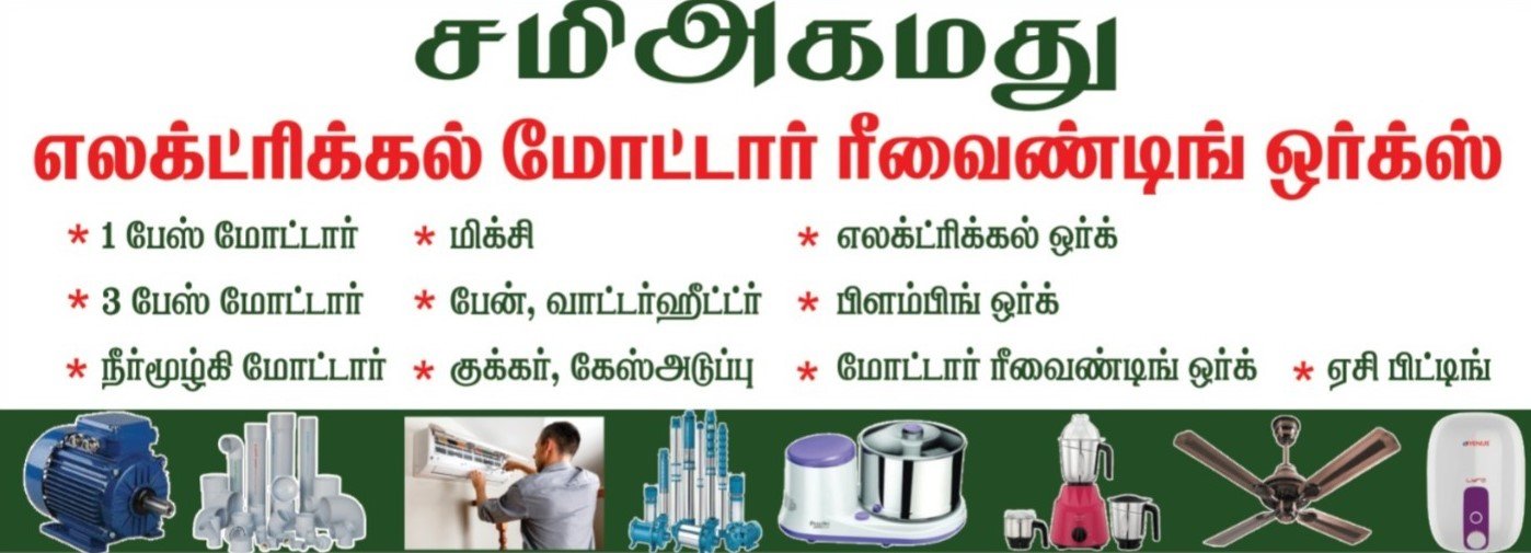 எங்களிடம் குடியிருப்பு மற்றும் வணிக கட்டிடங்கள்ளுக்கான அனைத்து வகையான 1 & 3 பேஸ் மோட்டார் சர்வீஸ், மோட்டர் ரீவைண்டிங் ஒர்க்ஸ், நீர்முழ்கி மோட்டார் சர்வீஸ், AC பிட்டிங், மிக்ஸி சர்வீஸ், பேன் சர்வீஸ், வாட்டர் ஹீட்டர் சர்வீஸ் , குக்கர் சர்வீஸ், கேஸ் ஸ்டவ் சர்வீஸ், எலக்ட்ரிகல் மற்றும் பிளம்பிங் ஒர்க்ஸ் உள்ளிட்ட அனைத்து வேலைகளும் சிறந்த முறையில் செய்து தரப்படும்.