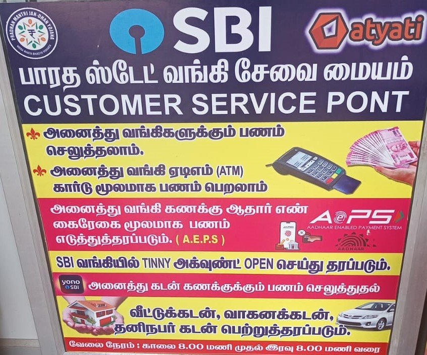 Tag: Money Transfer, ATM Cash Withdrawals, Aadhaar-enabled Payment Services (A.E.P.S), Open SBI Tiny Accounts, home/car/personal Loan payments, ST Courier Collection Center, Xerox, Stationary Products