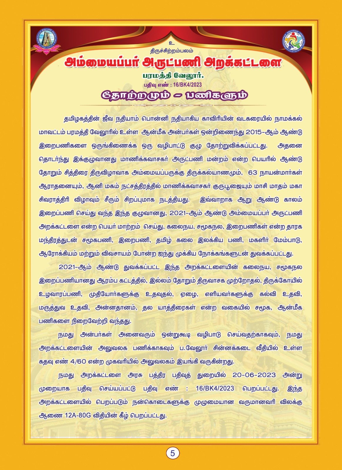 Welcome to Ammaiappar Arutpani Arakkattalai, a premier NGO registered service organization in Namakkal (Government Register No.: 16/BK4/2023). We are dedicated to serving society with a mission rooted in Kalainaya, Samuganala, and Iraipani.