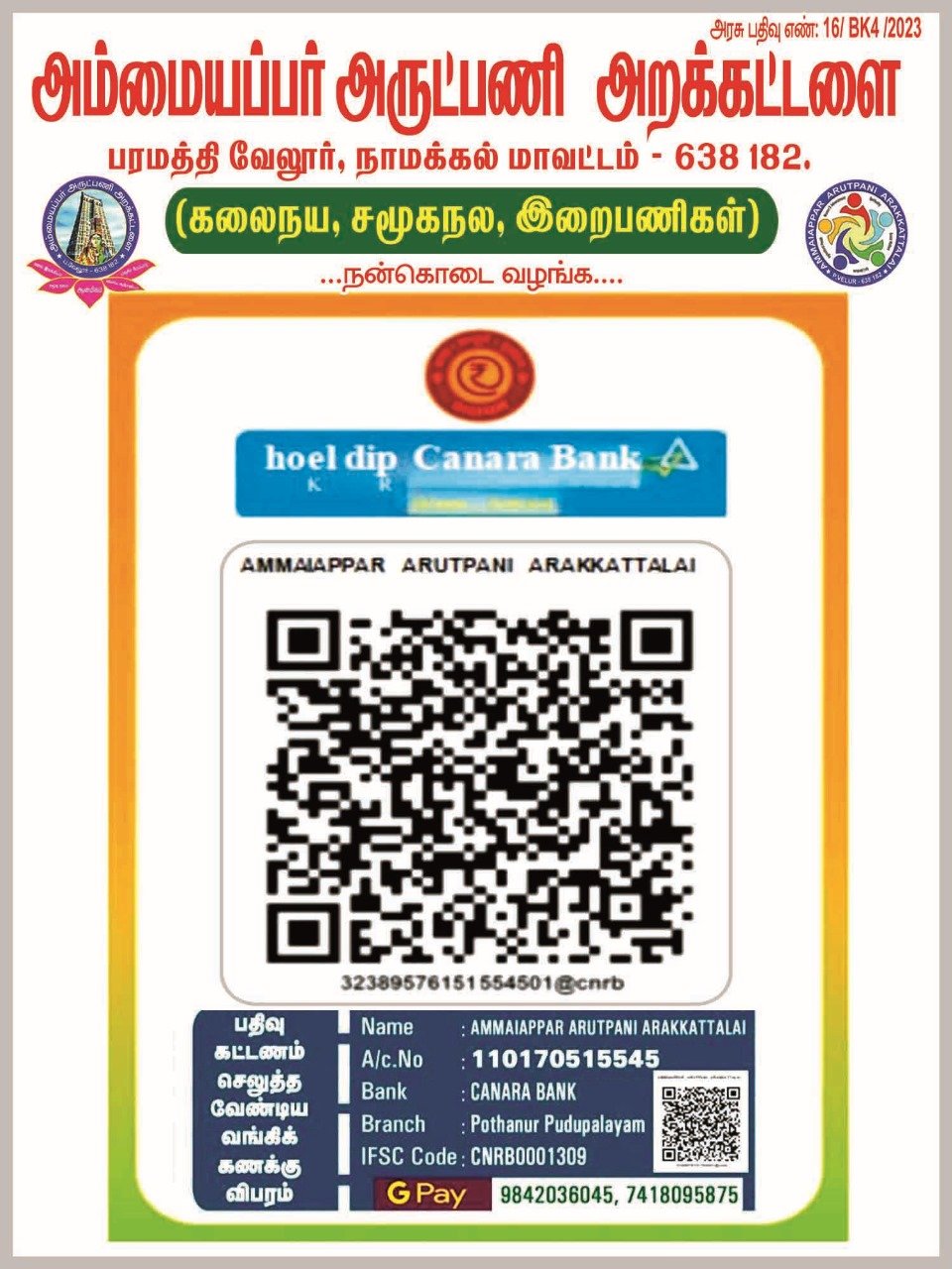 பதிவு செய்து நேரடியாக தங்கள் Gpay/phone pay app மூலம் பணம் அனுப்பலாம் என்பதையும் அன்புடன் தெரிவித்துக் கொள்கின்றோம்.