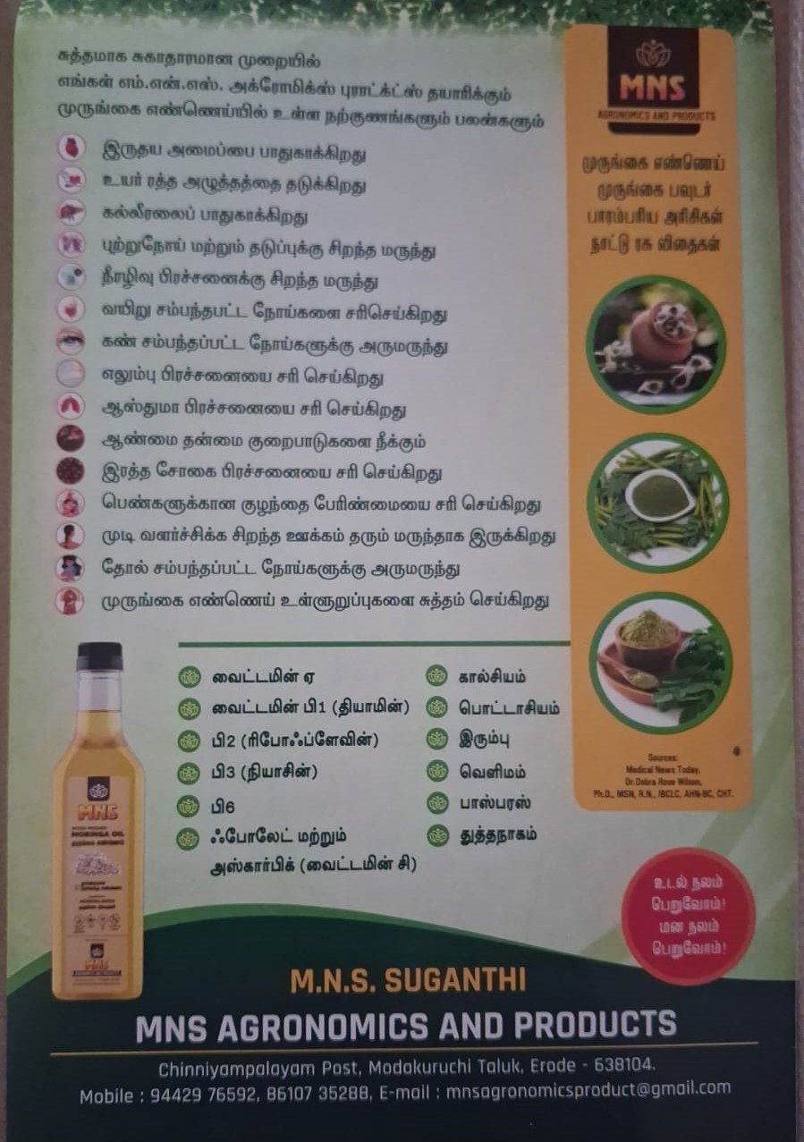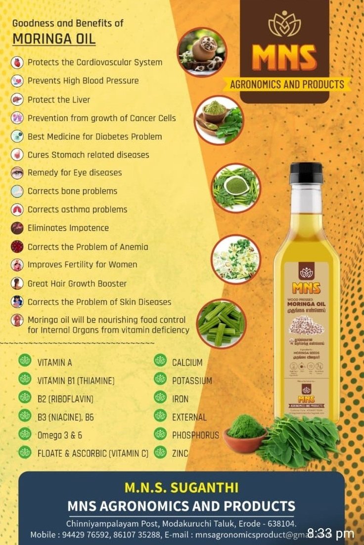 எங்களிடம் உயர்தரமான, மிகவும் ஆரோக்கியமான மற்றும் இயற்கையான முறையில் தயாரிக்கப்பட்ட முருங்கை எண்ணெய், முருங்கை விதை மற்றும் முருங்கை இலை சூப் பொடியை சிறந்த முறையில் கிடைக்கும்.