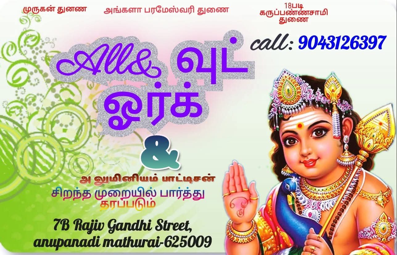 எங்களிடம் உயர்தரமான முறையில் வுட் ஒர்க்ஸ், அலுமினியம் பார்ட்டேசன் ஒர்க்ஸ், மற்றும் ஆர்க் வெல்டிங் ஒர்க்ஸ் உள்ளிட்ட அனைத்து வகையான வேலைகளும் சிறந்த முறையில் செய்து தரப்படும்.