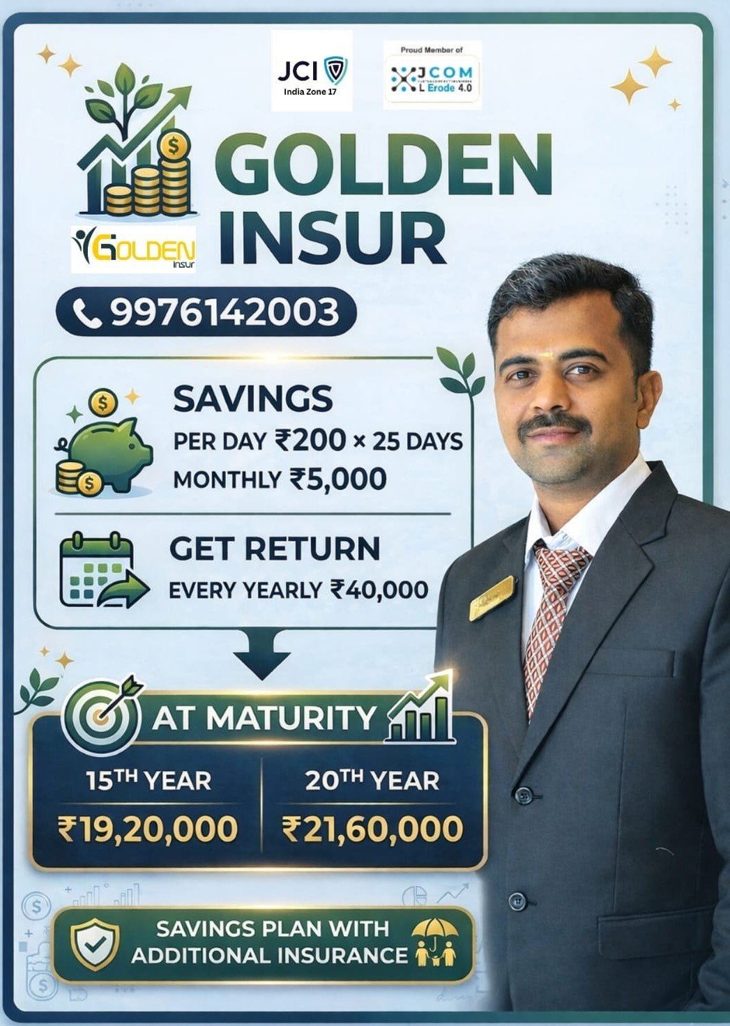 3. Golden Insurance: A savings plan with additional insurance benefits. Save Rs. 200 per day for 25 days, receive Rs. 5,000 monthly, Rs. 40,000 yearly, and at maturity enjoy Rs. 19,20,000 (15 years) or Rs. 21,60,000 (20 years).