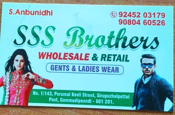 SSS Brothers Gents & Ladies Wear is promoted by S.Anbunidhi at Gummudipoondi. We work hard to provide excellent customer service to all our clients.