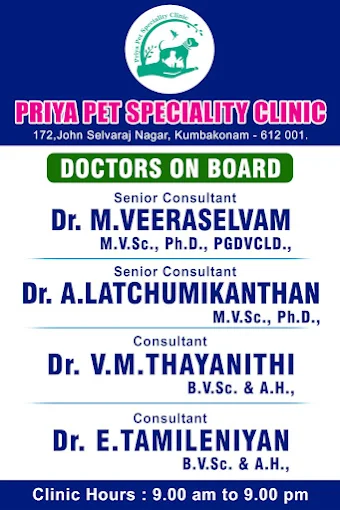 Priya Pet Speciality Clinic is promoted by Dr Tamileniyan E at Kumbakonam. We work hard to provide excellent customer service to all our clients.