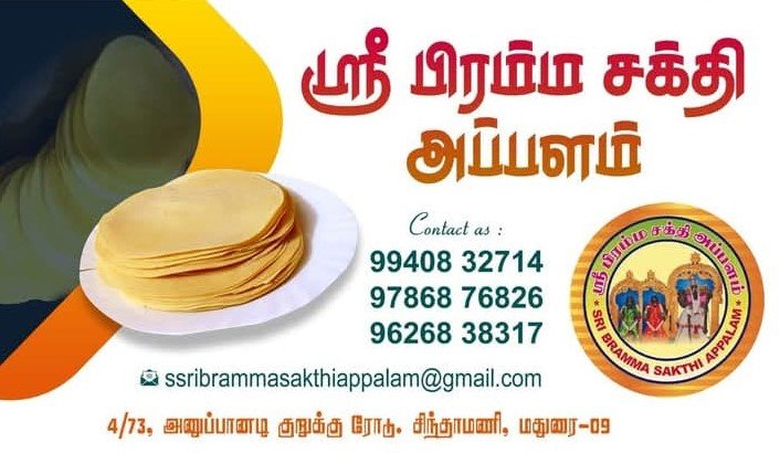 Sri Bramma Sakthi Appalam is promoted by G.Pradeep at Madurai. We work hard to provide excellent customer service to all our clients.