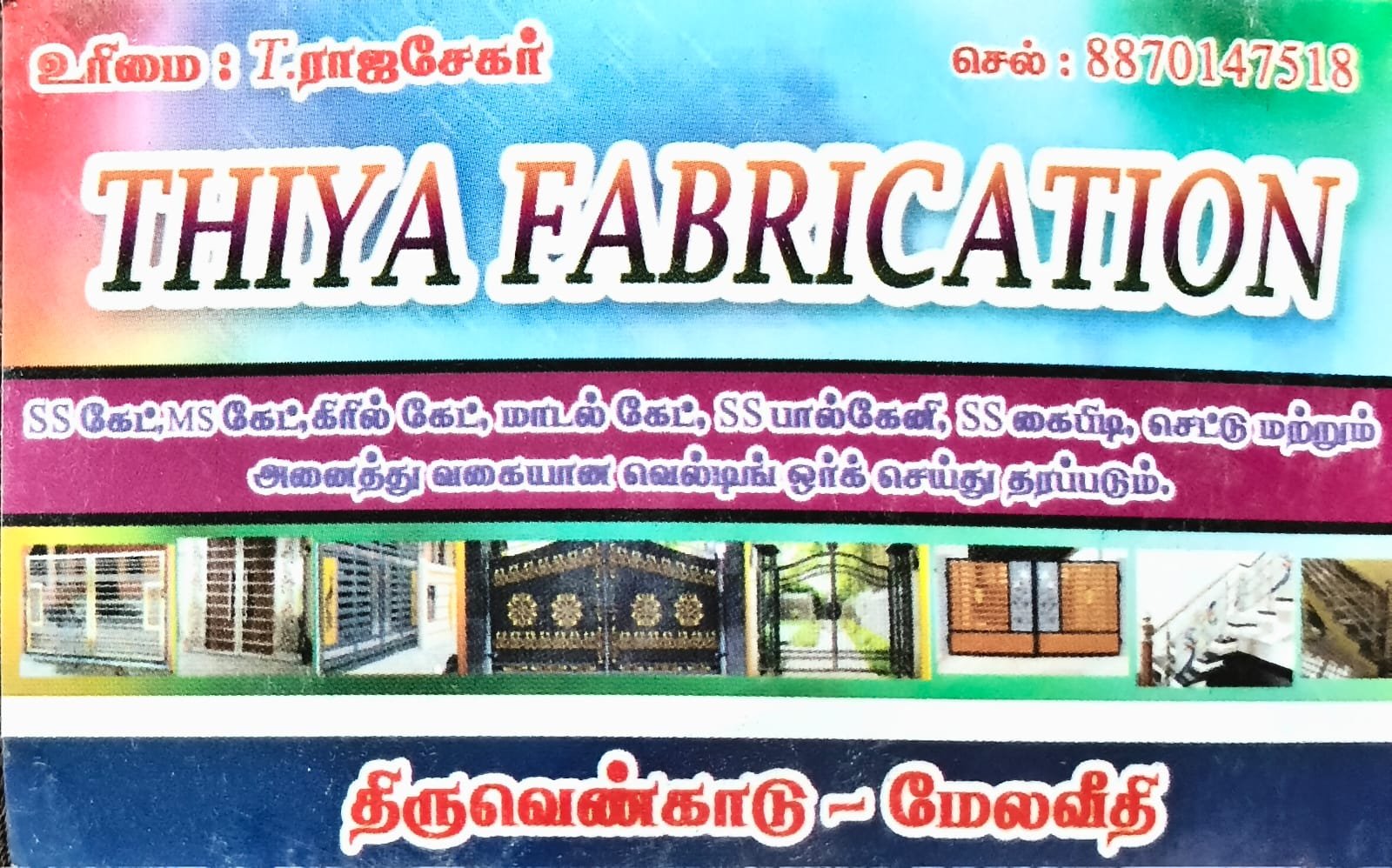 Thiya Fabrication is promoted by T.Rajasekar at Thiruvenkadu. We work hard to provide excellent customer service to all our clients.