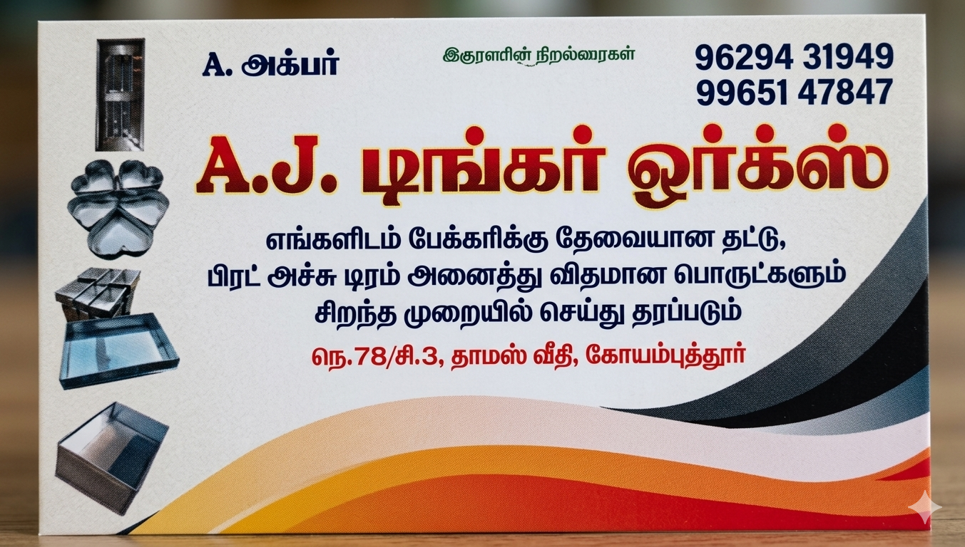 கோயம்புத்தூரில் A. அக்பர் அவர்களால் நிர்வகிக்கப்படும் AJ டிங்கர் ஒர்க்ஸ் (AJ Tinker Works), உங்களின் தேவைகளுக்கு ஏற்ப உயர்தர பேக்கரி உபகரணங்களைச் சிறந்த முறையில் தயாரித்து வழங்குகிறது. துல்லியம் மற்றும் நீடித்துழைக்கும் தன்மையுடன் கூடிய பேக்கரி கருவிகள் முதல் சேமிப்பு கலன்கள் வரை அனைத்துப் பொருட்களையும் நாங்கள் உற்பத்தி செய்கிறோம்.