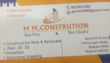 MM Construction is promoted by S.Mani kandan at Madurai. We work hard to provide excellent customer service to all our clients.