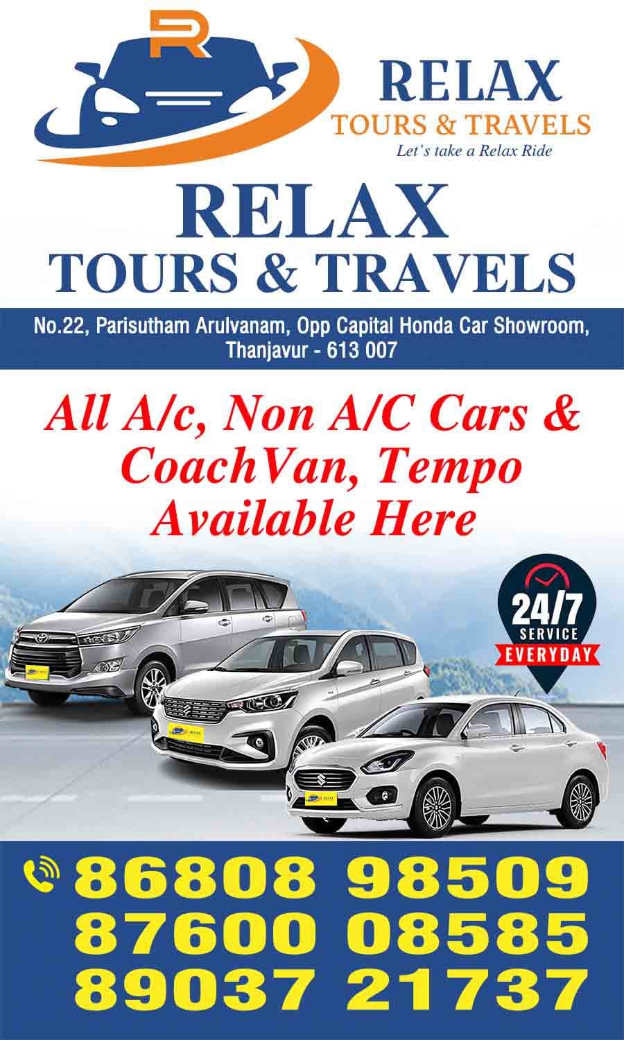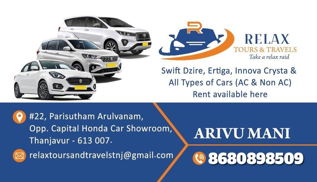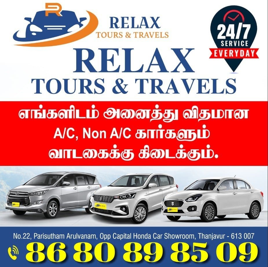 தஞ்சாவூரில் இயங்கி வரும் Relax Tours & Travels, தனது வாடிக்கையாளர்களுக்குச் சிறந்த மற்றும் தரமான பயணச் சேவையை வழங்குவதில் முன்னணியில் உள்ளது. குறுகிய கால நகரப் பயணங்கள் முதல் நீண்ட தூர சுற்றுலாப் பயணங்கள் வரை, உங்களின் ஒவ்வொரு தேவைக்கும் ஏற்றவாறு பலதரப்பட்ட வாகன வசதிகளை நாங்கள் வழங்குகிறோம்.