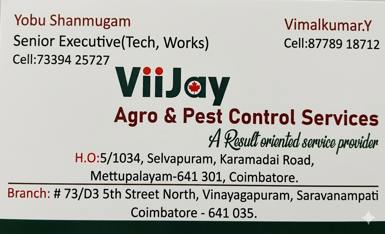 73/D5 5th Street North, Vinayagapuram, Saravanampati, coimbatore-641035கோயம்புத்தூரில் திரு. விஜய் அவர்களால் நிர்வகிக்கப்படும் எங்களது நிறுவனம், கடந்த 30 ஆண்டுகளுக்கும் மேலாக விவசாயம், தோட்டக்கலை மற்றும் பூச்சிக் கட்டுப்பாடு துறையில் நிபுணத்துவம் பெற்ற சேவைகளை வழங்கி வருகிறது. நாங்கள் உலக சுகாதார அமைப்பால் (WHO) அங்கீகரிக்கப்பட்ட மற்றும் BIS தரச் சான்று பெற்ற, மனிதர்களுக்கும் செல்லப்பிராணிகளுக்கும் பாதுகாப்பான மருந்துகளை மட்டுமே பயன்படுத்துகிறோம்.