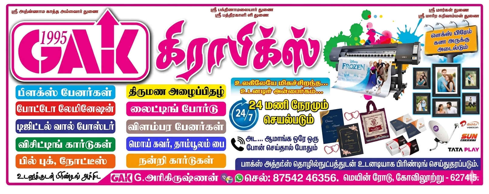 தென்காசியில் GAK அவர்களால் நடத்தப்படும் GAK கிராபிக்ஸ், உங்களின் கற்பனைகளை நவீன டிஜிட்டல் தொழில்நுட்பம் மற்றும் படைப்பாற்றல் மூலம் மிகச்சிறந்த முறையில் நிஜமாக்குகிறது. நாங்கள் வாடிக்கையாளர்களின் திருப்தியை முதன்மையாகக் கொண்டு, உயர்தரமான பிரிண்டிங் சேவைகளை வழங்கி வருகிறோம்.
