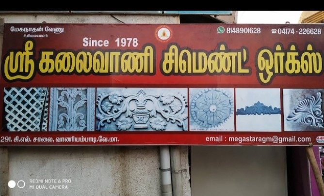 வாணியம்பாடியில் மேகநாதன் வேணு அவர்களால் நடத்தப்படும் ஸ்ரீ கலைவாணி சிமெண்ட் ஒர்க்ஸ், நவீன கட்டுமானத் திட்டங்களுக்குத் தேவையான உயர்தர சிமெண்ட் பொருட்கள் மற்றும் முன்வார்க்கப்பட்ட (Pre-cast) கட்டுமான தீர்வுகளை வழங்குவதில் முன்னணியில் உள்ளது. சிறந்த மூலப்பொருட்கள் மற்றும் நேர்த்தியான வேலைப்பாடுகளைக் கொண்டு, உங்கள் கட்டிடங்களின் வலிமை மற்றும் நீண்ட கால உழைப்பிற்கு நாங்கள் உத்தரவாதம் அளிக்கிறோம். வாடிக்கையாளர்களுக்குச் சிறந்த சேவையை வழங்குவதே எங்களது முதன்மையான நோக்கமாகும்.