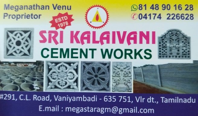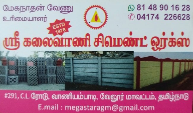 Sri Kalaivani Cement Works is promoted by Meganathan venu at Vaniyambadi. We work hard to provide excellent customer service to all our clients.