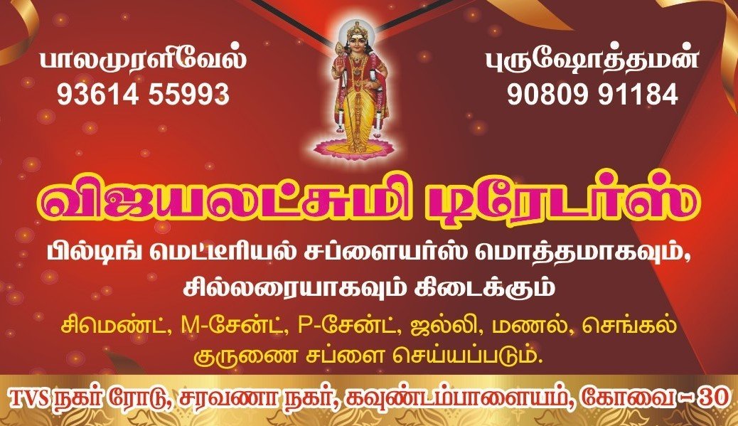 எங்களிடம் உயர்தரமான 4" & 6" சாலிட் ப்லாக்ஸ், சிமெண்ட், M & P சேன்ட் , செங்கல், ஜல்லி, மணல் மற்றும் குருணை உள்ளிட்ட அனைத்து விதமான கட்டுமானப் பொருட்களும் மொத்தமாகவும் சில்லறையாகவும் சிறந்த முறையில் கிடைக்கும்.