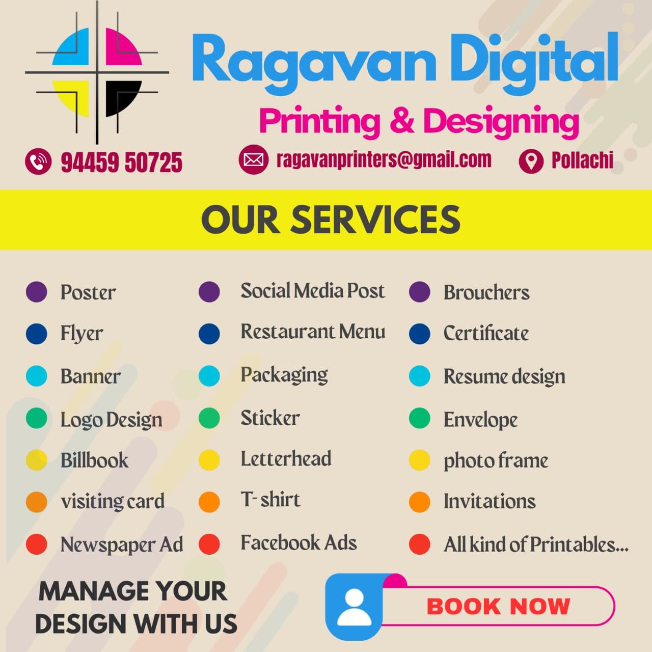 Ragavan Digital Printing & Designing is promoted by Ragavan Digital Printing & Designing at Pollachi. We work hard to provide excellent customer service to all our clients.