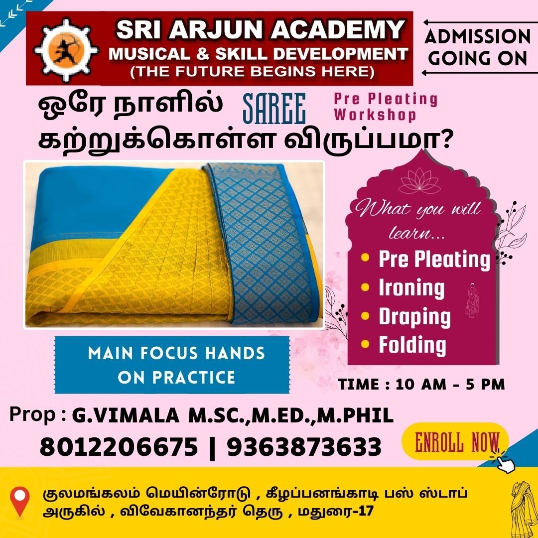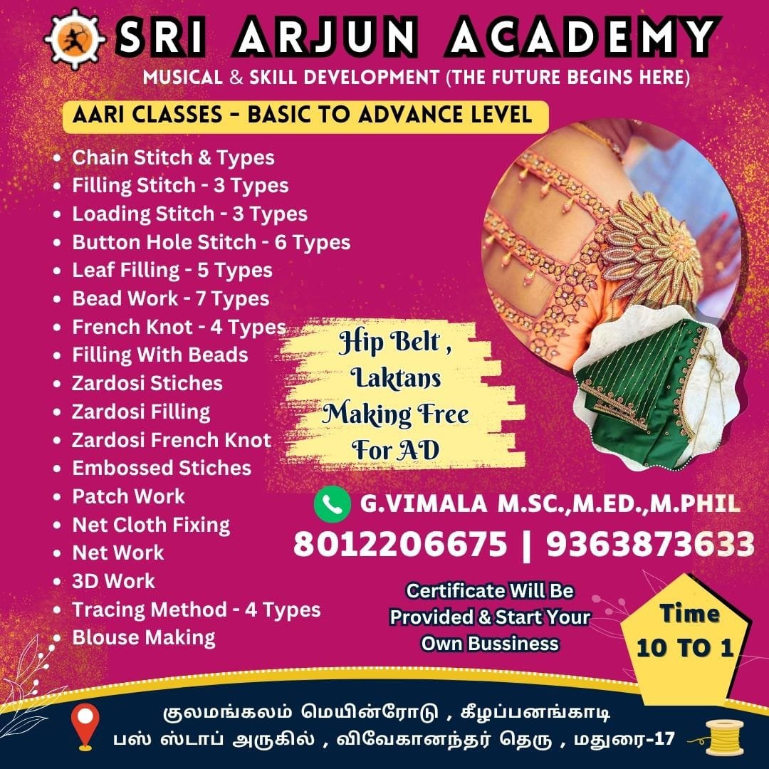 With expert guidance, high-quality materials, and a supportive learning environment, we ensure every participant gains practical knowledge and confidence. Whether you’re looking to enhance your creativity, start a hobby, or learn professional skills, Sri Arjun Academy is your trusted destination in Madurai.