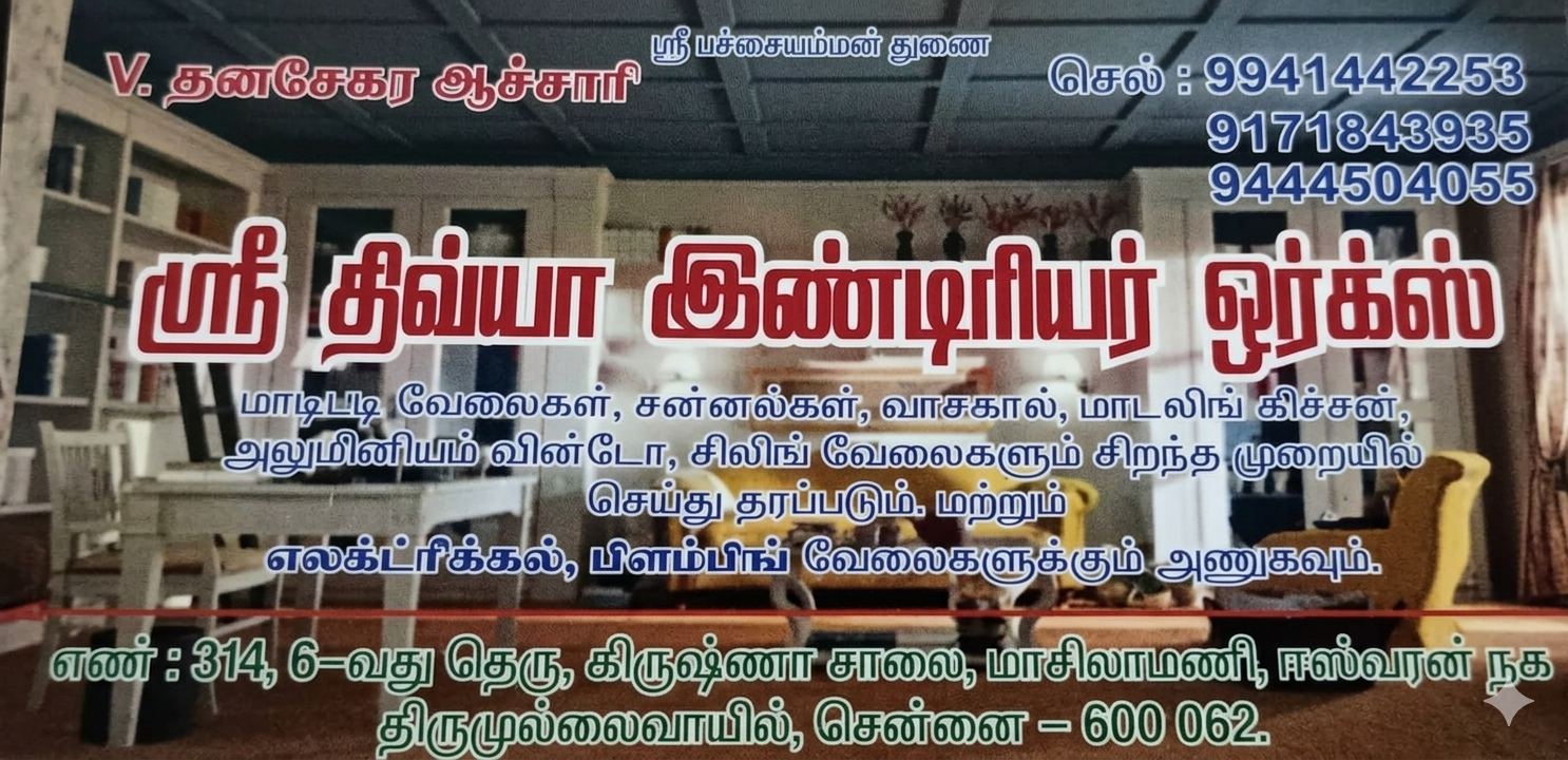 சென்னையில் V. தனசேகரன் ஆச்சாரி அவர்களால் நிர்வகிக்கப்படும் ஸ்ரீ திவ்யா இன்டீரியர் ஒர்க்ஸ், உங்களின் குடியிருப்பு மற்றும் வணிக இடங்களை மிகச்சிறந்த முறையில் வடிவமைத்துத் தருகிறது. வாடிக்கையாளர்களின் விருப்பத்திற்கேற்ப தரம் மற்றும் நேர்த்தியுடன் உள்அலங்காரப் பணிகளை நாங்கள் செய்து முடிக்கிறோம்.