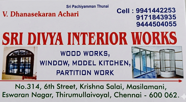 Sri Divya Interior Works is promoted by V.Dhanasekaran Achari at Chennai. We work hard to provide excellent customer service to all our clients.