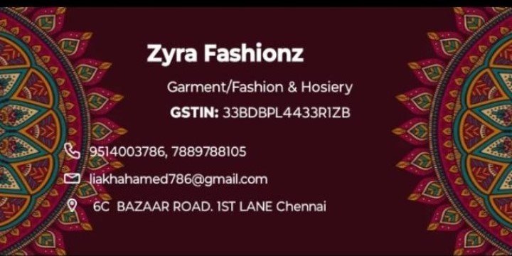 Zyra Fashionz is promoted by Lakih Ahmed at Chennai. We work hard to provide excellent customer service to all our clients.