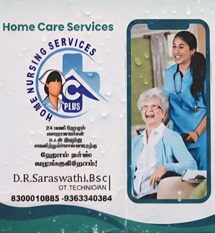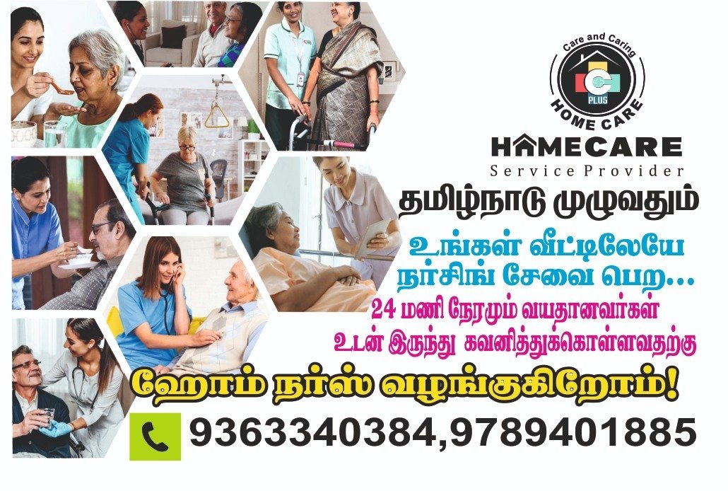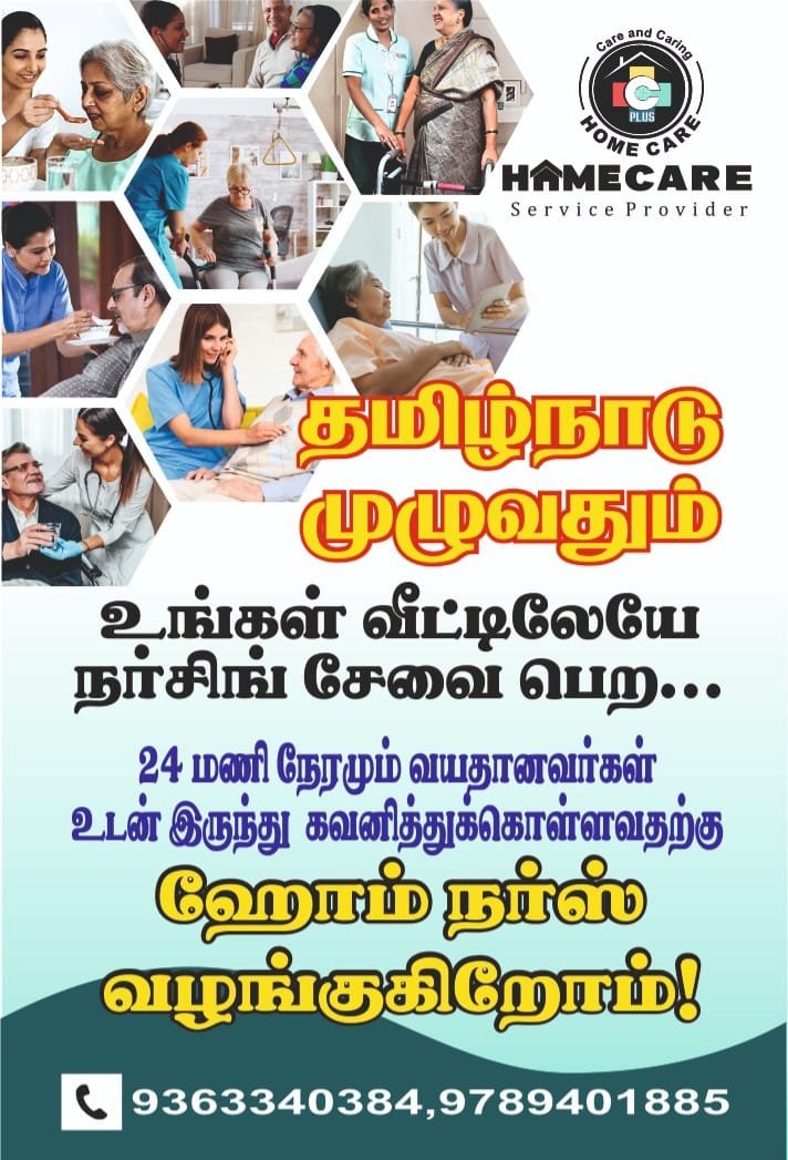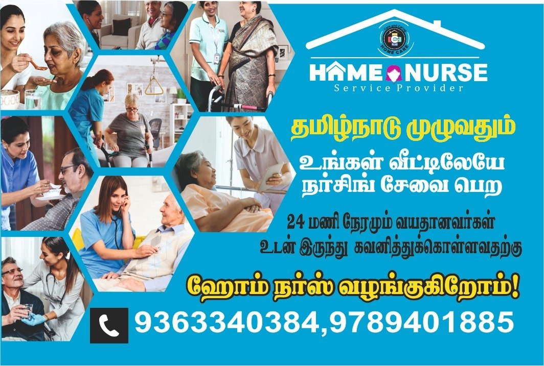 நங்கள் உங்கள் வீட்டிலேயே நர்சிங் சேவை, 24 மணிநேரமும் வயதானவர் உடன் இருந்து கவனித்து கொள்ள ஹோம் நர்ஸ், பேபி கேர், மற்றும் பல உள்ளிட்ட ஹோம் கேர் சேவைகளும் தமிழ்நாடு முழுவதும் சிறந்த முறையில் செய்து தருகிறோம்.