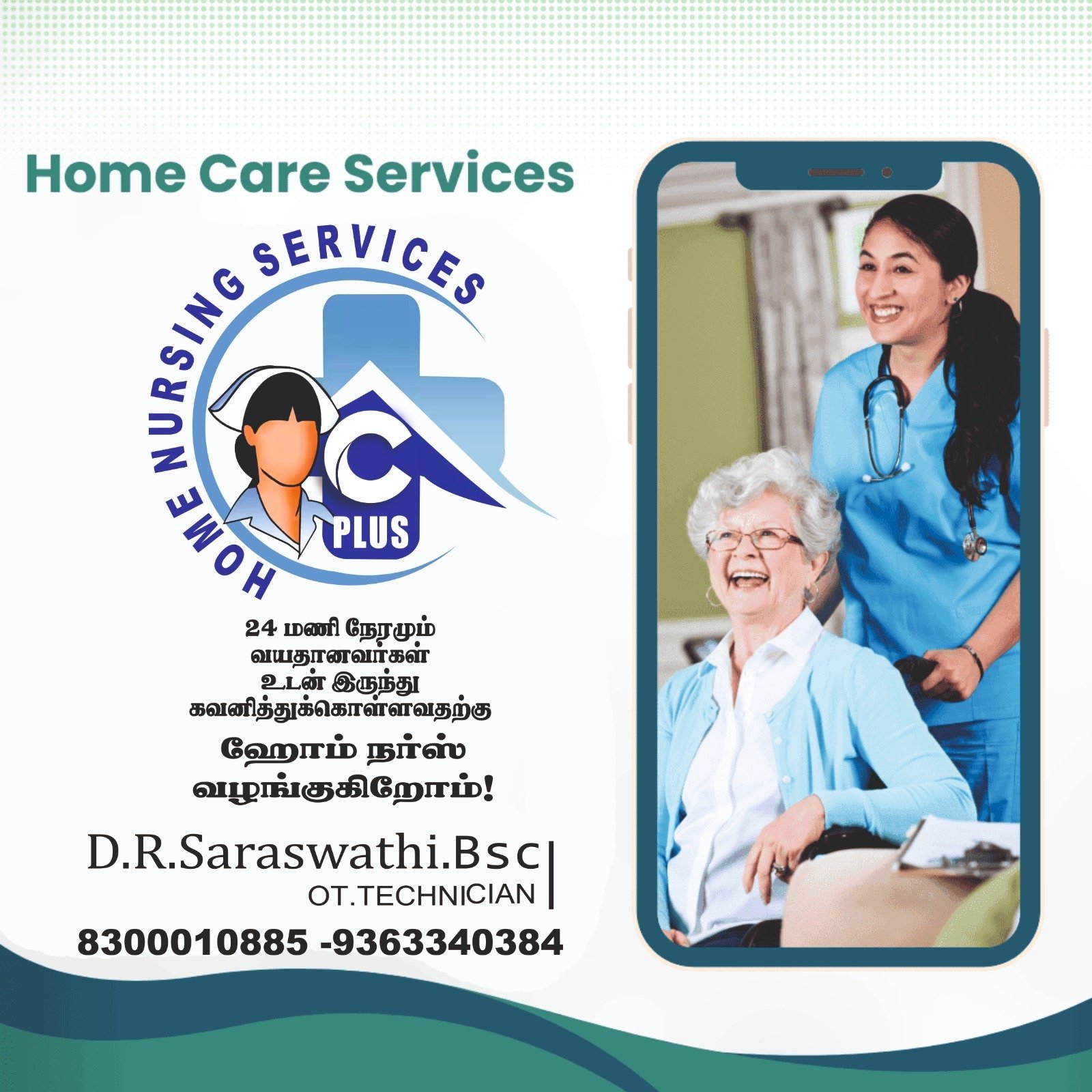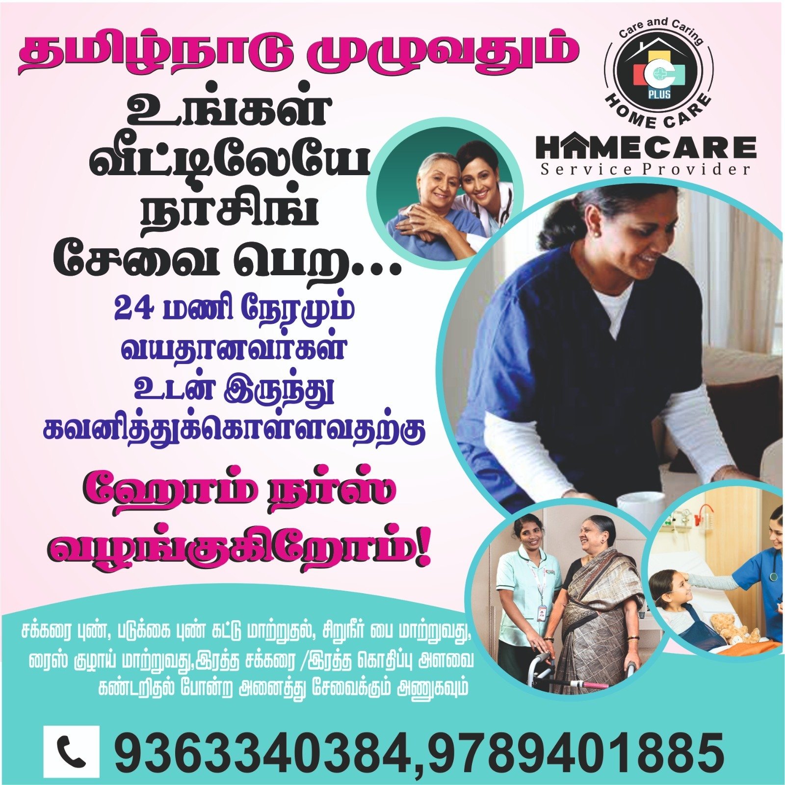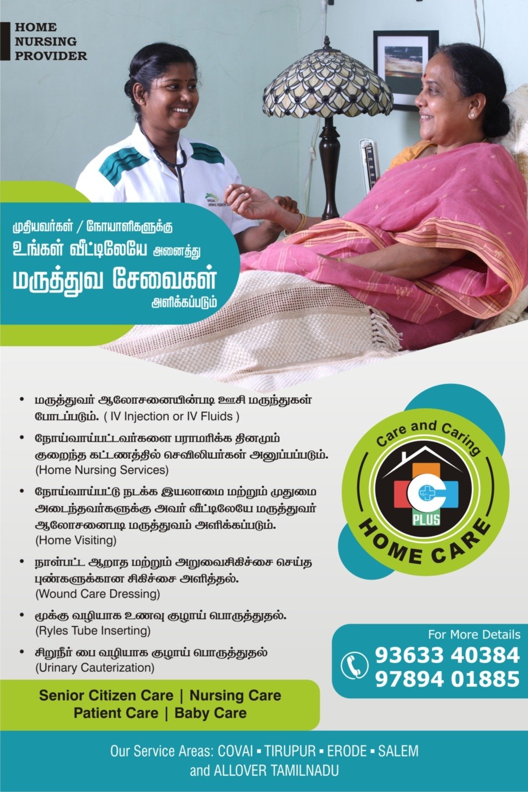 நங்கள் உங்கள் வீட்டிலேயே நர்சிங் சேவை, 24 மணிநேரமும் வயதானவர் உடன் இருந்து கவனித்து கொள்ள ஹோம் நர்ஸ், பேபி கேர், மற்றும் பல உள்ளிட்ட ஹோம் கேர் சேவைகளும் தமிழ்நாடு முழுவதும் சிறந்த முறையில் செய்து தருகிறோம்.