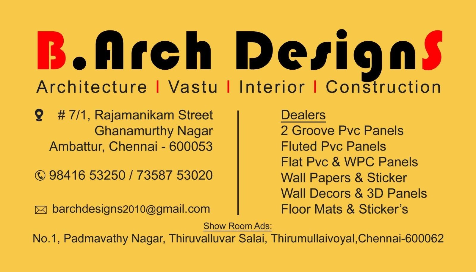 B.Arch Designs is promoted by Bharani Kumar at Chennai. We work hard to provide excellent customer service to all our clients.
