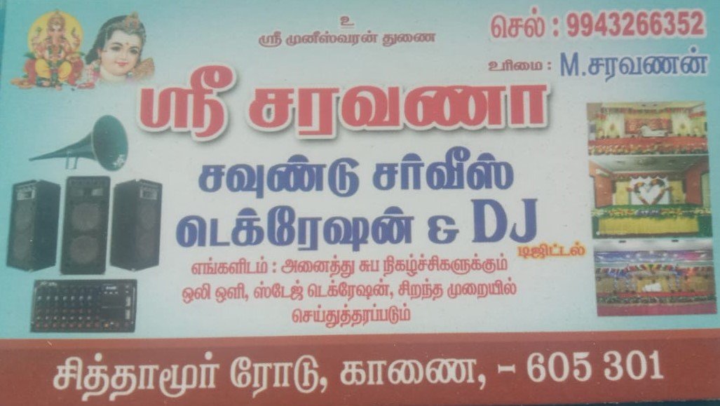 Sri Saravana Sound Service Decoration & DJ is promoted by M.Saravanan at Villupuram. We work hard to provide excellent customer service to all our clients.