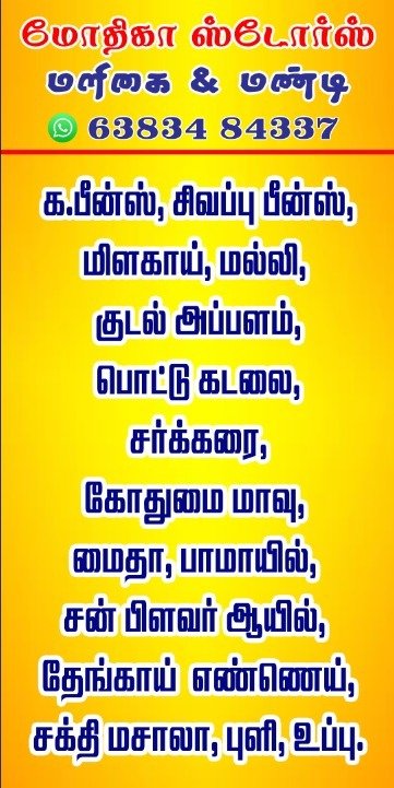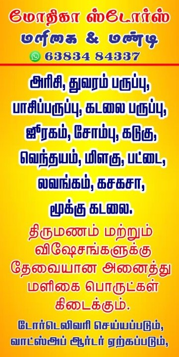 எங்களிடம் திருமணம் மற்றும் விஷேசங்களுக்கு தேவையான அனைத்து மளிகை பொருட்கள் கிடைக்கும். டோர்டெலிவரி வசதியும் செய்யப்படும், வாட்ஸ்அப் ஆர்டர் ஏற்கப்படும்.