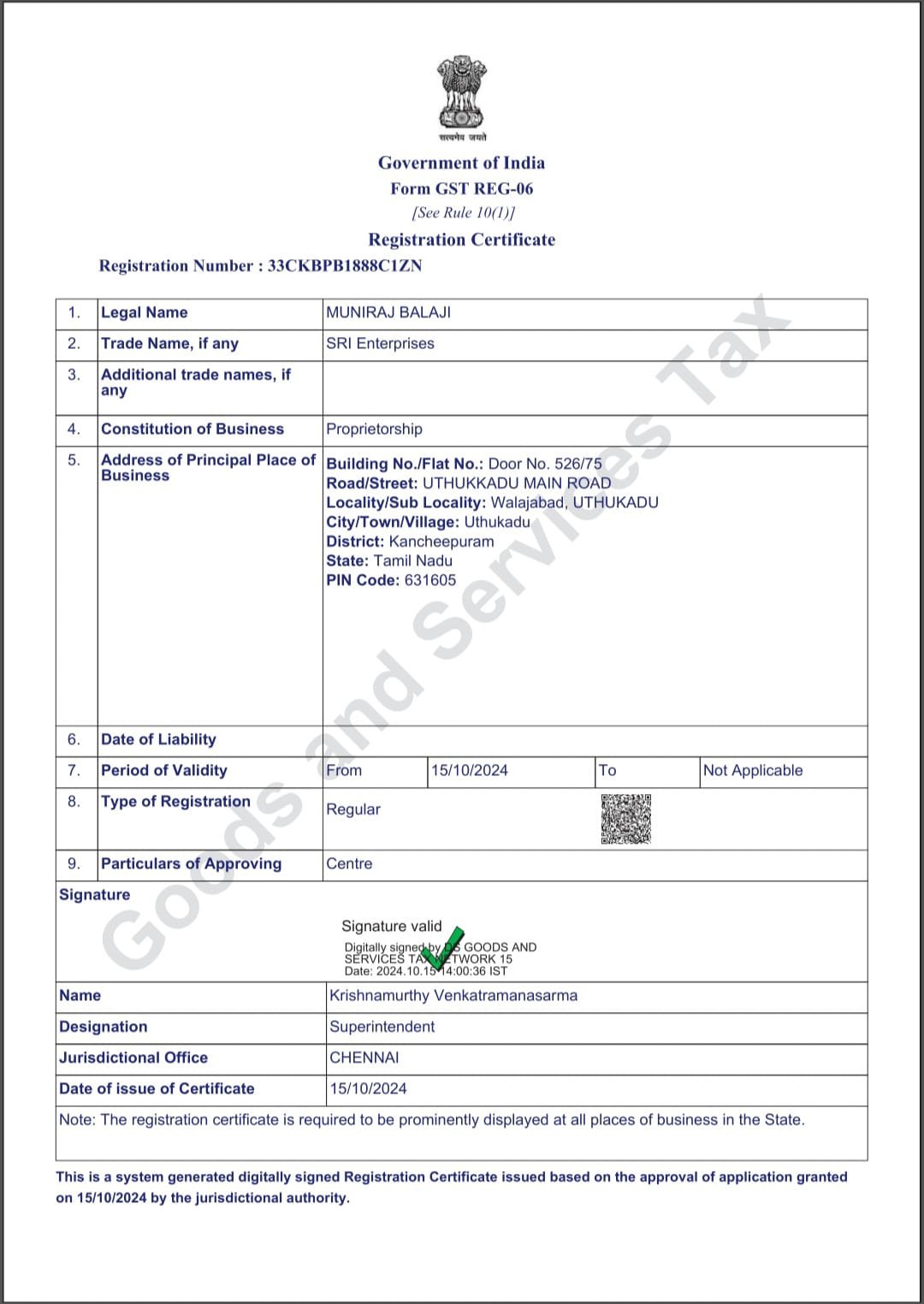 SRI Enterprises is promoted by Muniraj Balaji at Kancheepuram. We work hard to provide excellent customer service to all our clients.