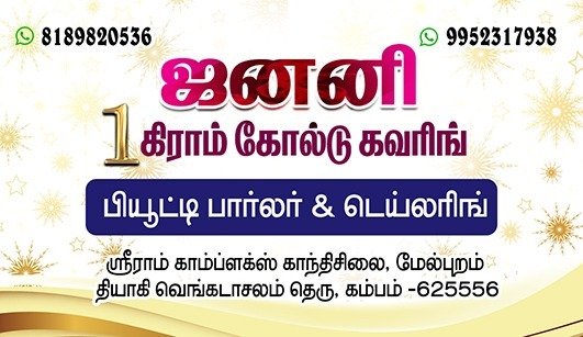 மேலும் ஜனனி 1 கிராம் கோல்ட் கவரிங்ஒரு நவீன மற்றும் பாரம்பரிய தோற்றத்தை வழங்கக்கூடிய ஒரு அழகு கலை பார்லர் மற்றும் டைலரிங் ஷாப் ஆகும்.