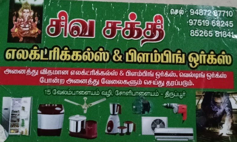 Siva Sakthi Electricals & Plumbing Works is promoted by Siva Sakthi at Tirupur. We work hard to provide excellent customer service to all our clients.