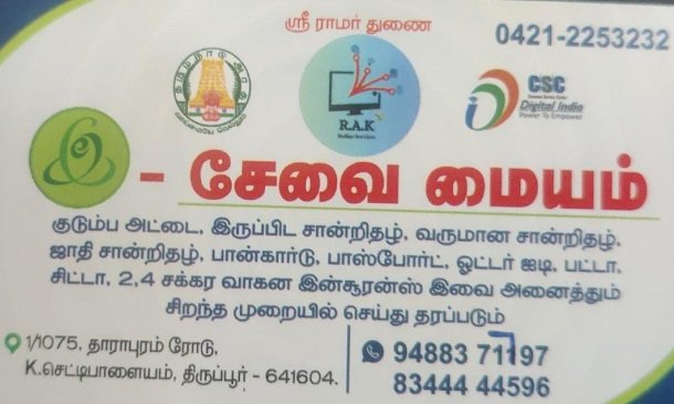 திருப்பூரில் இயங்கி வரும் RAK பொது சேவை மையம், திரு. ராஜேஷ் கண்ணா அவர்களால் நிர்வகிக்கப்படுகிறது. எங்கள் வாடிக்கையாளர்களுக்குச் சிறந்த மற்றும் விரைவான சேவையை வழங்குவதையே நாங்கள் நோக்கமாகக் கொண்டுள்ளோம்.