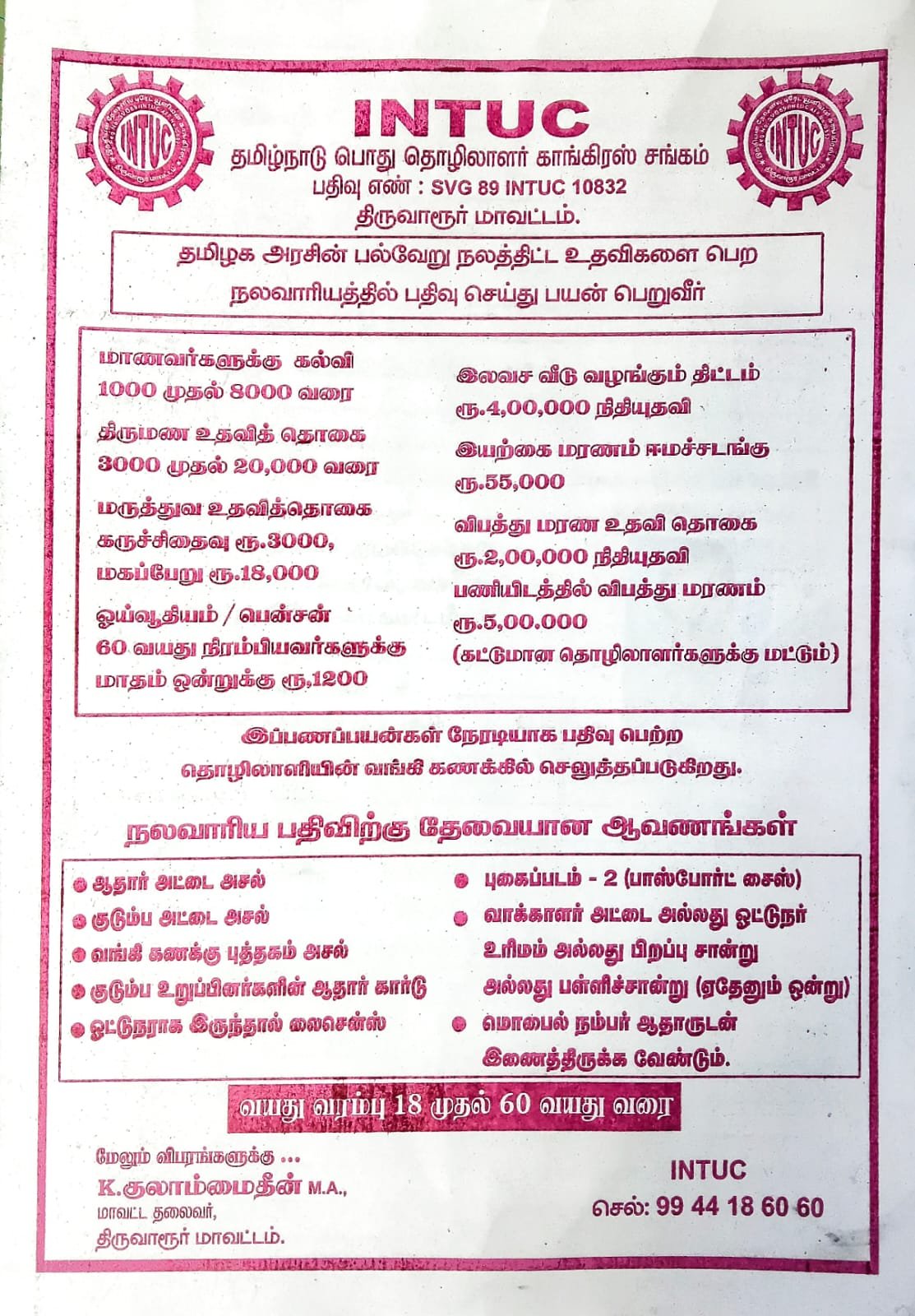 INTUC Thiruvarur is promoted by K. Ghulam Mohideen, M.A., District President at Thiruvarur. We work hard to provide excellent customer service to all our clients.