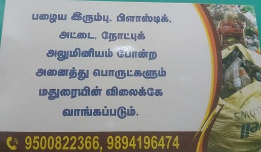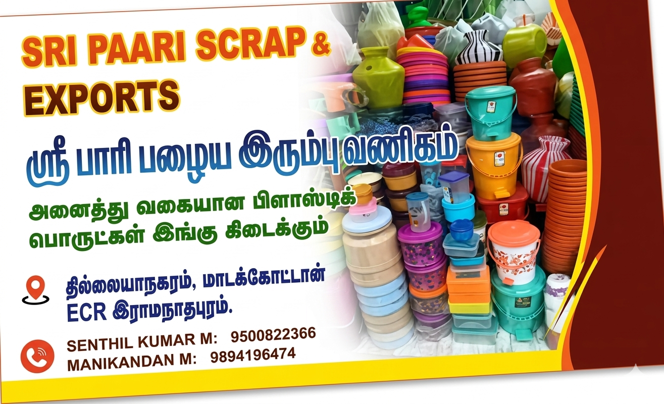 ராமநாதபுரத்தில் திரு. M. மணிகண்டன் அவர்களால் நிர்வகிக்கப்படும் ஸ்ரீ பாரி ஸ்கிராப் & எக்ஸ்போர்ட்ஸ், மறுசுழற்சி மற்றும் கழிவு மேலாண்மைத் துறையில் சிறந்த சேவையை வழங்கி வருகிறது. பழைய பொருட்களை விற்பனை செய்யும் வாடிக்கையாளர்களுக்கு லாபகரமான விலையை உறுதி செய்யும் வகையில், அனைத்து வகையான பழைய பொருட்களையும் "மதுரை மார்க்கெட் விலைக்கு" நாங்கள் நேரடியாகக் கொள்முதல் செய்கிறோம்.