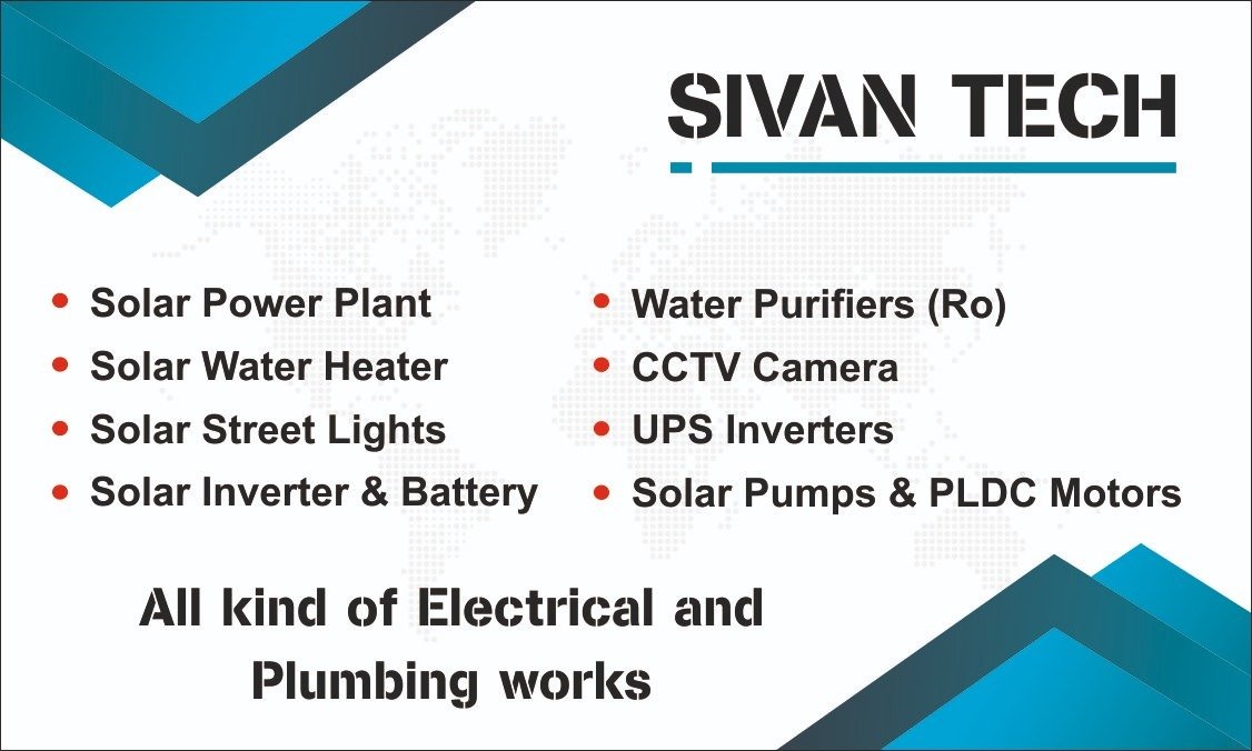 எங்களிடம் அலுவலகம், குடியிருப்பு மற்றும் வணிக கட்டிடங்கள்ளுக்கு தேவையான சோலார் சர்வீஸ் (பவர் பிளான்ட், வாட்டர் ஹீட்டர்,தெரு விளக்குகள், இன்வெர்ட்டர்கள், பேட்டரி, பம்புகள் மற்றும் PLDC மோட்டார்கள்), CCTV கேமரா சர்வீஸ், UPS இன்வெர்ட்டர் சர்வீஸ், RO வாட்டர் ப்யூரிஃபைர் சர்வீஸ், மற்றும் பல உள்ளிட்ட அனைத்து வகையான எலக்ட்ரிகல் மற்றும் பிளம்பிங் வேலைகள் சிறந்த முறையில் செய்து தரப்படும்.