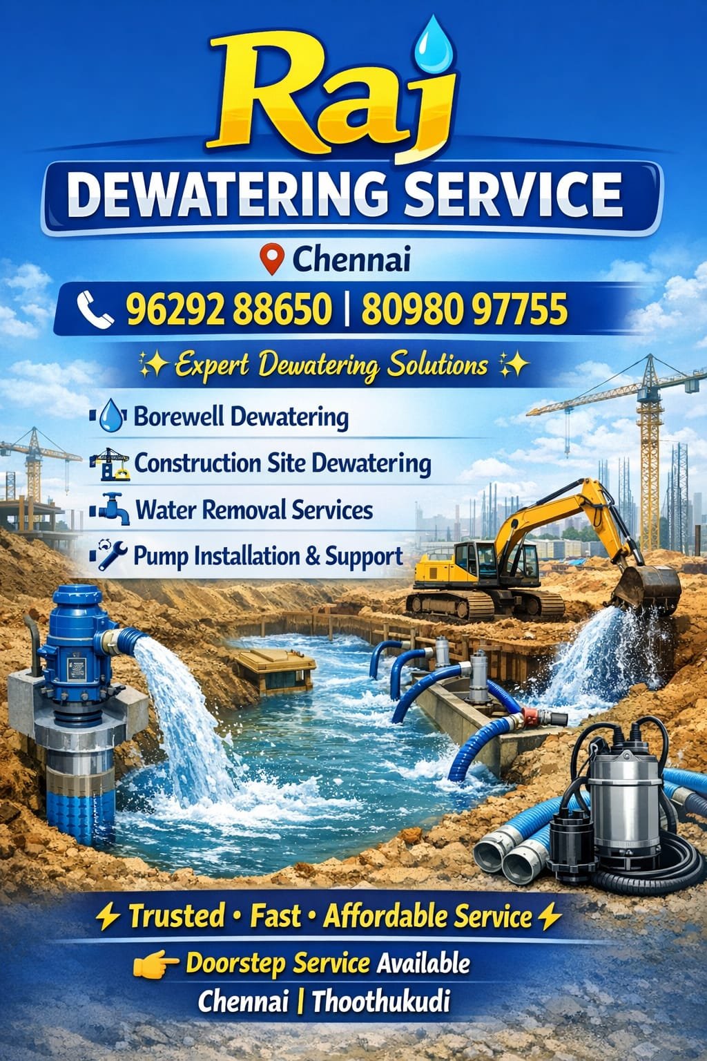 Welcome to Raj Dewatering Service, your trusted partner for reliable and efficient dewatering solutions. Based in Thoothukudi and serving Chennai as well, we specialize in delivering professional services that ensure smooth operations for residential, commercial, and industrial projects.